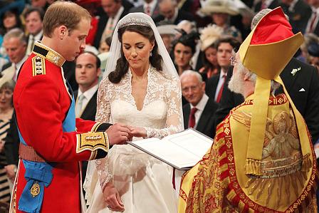 A menyasszonyt édesapja vezette az oltárhoz, ahol Vilmos és Harry várta őket. Catherine esküvői ruháját Vilmos is akkor látta először, amikor menyasszonya bevonult a templomba.