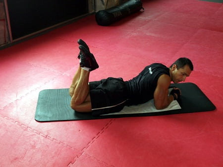 Feküdj hasra, támaszkodj a könyökeiden. Lábaid nyújtsd ki, lábfejeid feszítsd előre. Hajlítsd majd be a térdeid úgy, hogy a sarkaiddal érintsd meg a feneked, aztán térj vissza az eredeti helyzetbe. Ismételd 16-szor.