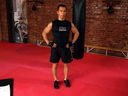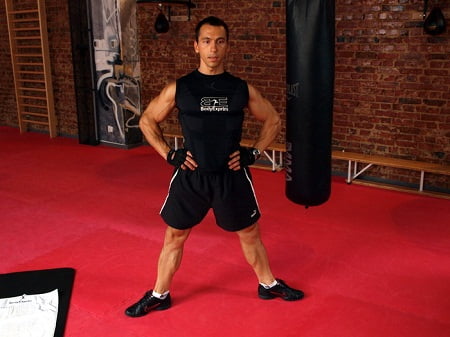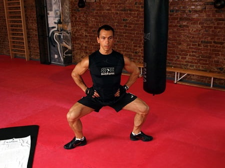 Állj terpeszben, lábfejeid kifele nézzenek. Végezz guggolást ebben a testhelyzetben úgy, hogy a medencéd lejjebb engeded addig, míg szinte párhuzamos nem lesz a combjaid alkotta vonal a talajjal. Mikor felemelkedsz, feszítsd meg a farizmaid, hogy hatásosabb legyen a gyakorlat. 16-szor ismételd.