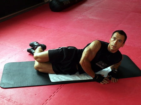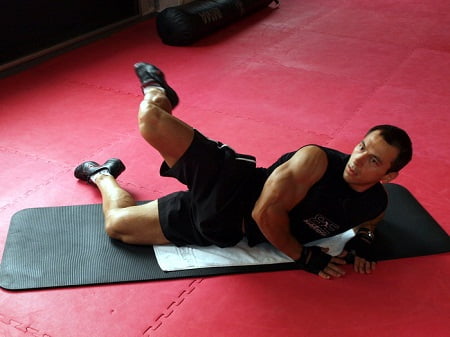 Feküdj a talajon, féloldalt, könyökre támaszkodva. Lábaid hajlítsd be, hogy térdeid derékszöget alkossanak, majd a felül lévő lábad emeld ebben a pozícióban a magasba. (A gyakorlat úgy működik, mint az előző, csak behajlított lábakkal.) Kétszer 16 ismétlést végezz.