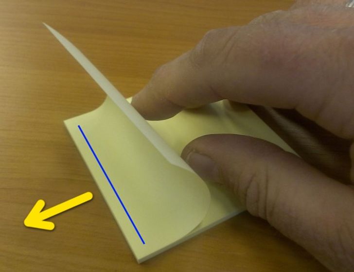 Ha lentről felfelé húzod le az öntapadós cetlit a jegyzettömbről, akkor a papír felkunkorodik, és idővel leesik onnan, ahová ragasztottad. Ennek elkerülése érdekében fordítsd oldalra a tömböt, és szakítsd le a cetlit a ragadós oldala mentén.