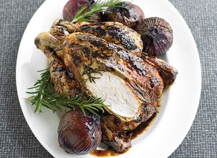 Hozzávalók: kb 1,5 kilogrammos csirke, 1 csokor rozmaring, 3 evőkanál olívaolaj, 4 megtisztított és egészben hagyott lilahagyma, 3 evőkanál balzsamecet, 1 evőkanál méz.