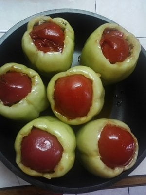 A paradicsomot vágjuk két részre, a belsejét tartsuk meg a szószhoz, a fél paradicsommal pedig zárjuk le a paprikákat. Helyezzük el a paprikákat egy edénybe, töltsünk rá vizet, adjunk hozzá babérlevelet, és lassú tűzön kezdjük el melegíteni.