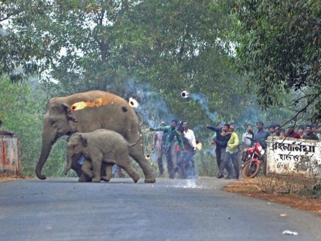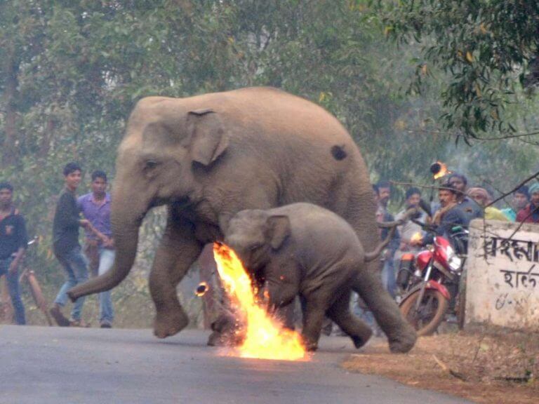 A képek az az indiai Sanctuary magazin fotópályázatán szerepeltek. India keleti részén egy nőstény elefánt és kicsinye menekülnek, az emberek pedig tűzbombával dobálják őket. Az indiai Bakura kerületben egyre több az elefántok és az emberek közötti összetűzés, mivel a nagy állatok rendszeresen megjelennek a lakott területeken.
